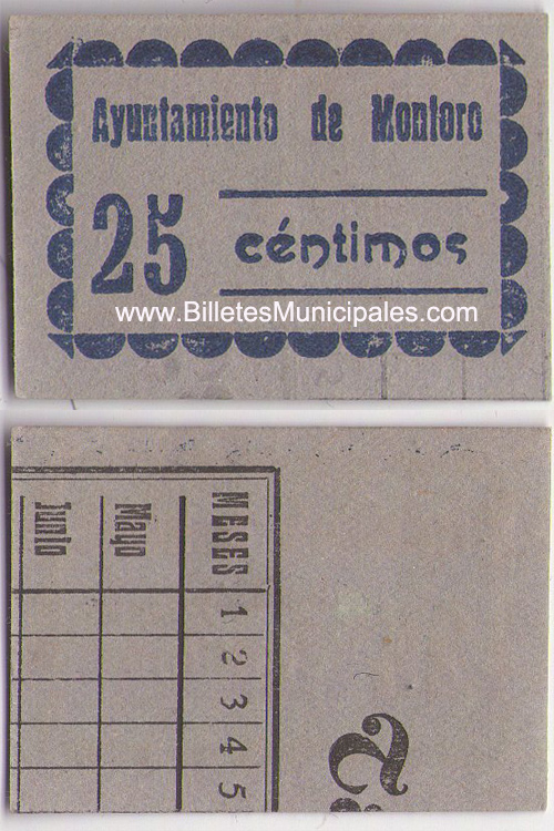 Al dorso de estos billetes de 5 pesetas al portador del 24 de Agosto de 1936, del Ayuntamiento Constitucional de Montoro (Córdoba), se puede apreciar una tabla de amortización. Esas cédulas de trabajo al portador tenían un valor inicial de 5 pesetas, que iba bajando. Los trabajadores, al ver que su dinero perdía valor cada semana y, probablemente, ante el miedo natural de quedarse sin parte de su salario, lo entregaban de nuevo al banco con rapidez. Eran 5 pesetas al portador y resultaba lógico que lo ingresaran directamente cuanto antes, puesto que perdían valor en caso de no hacerlo. De este modo aumentaba la velocidad de circulación del dinero, y los empresarios y los bancos podían volver a disponer de ese dinero en sus arcas. La citada técnica ya se había puesto en funcionamiento en otros lugares. De dicho billete evidentemente oxidable como se puede apreciar en la taba de amortización del dorso hemos encontrado en nuestra investigaciónes otro de mayor valor facial 50 pesetas.